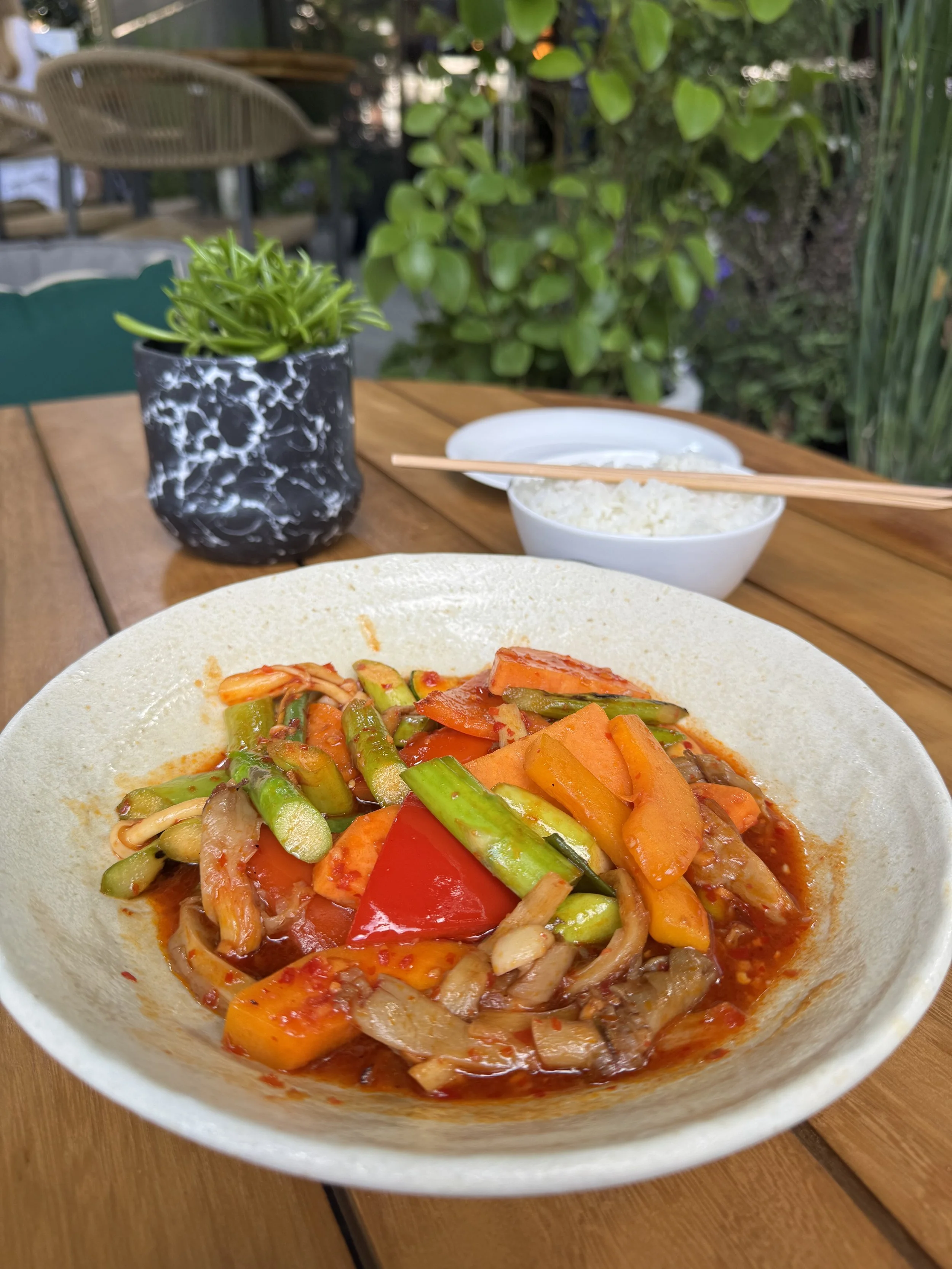 I ordered from their vegan menu, which already felt like a thoughtful and elevated take on plant-based cuisine. I started with tempura snap peas, followed by crispy rice topped with avocado, and a side of steamed rice with spicy mixed vegetables.